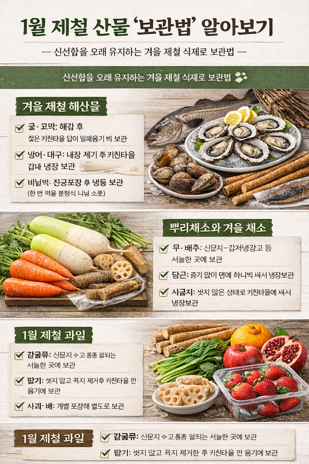 이번 글에서는 1월 제철 산물인 해산물, 채소, 과일을 신선하게 보관하는 방법을 총정리해보겠습니다.